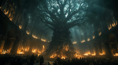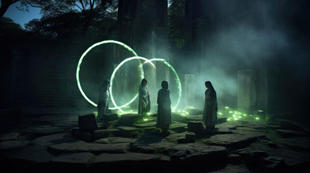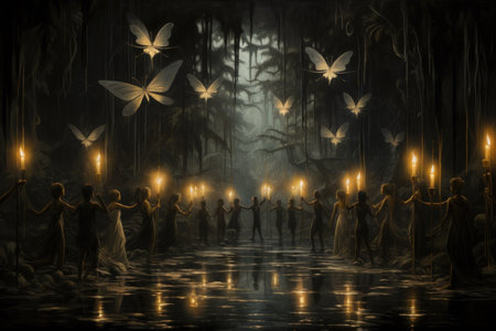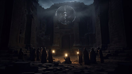 Under the night sky, a mysterious group of cloaked figures stood in stillness, illuminated only by the flickering light of their flickering candles