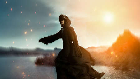 Fantasy world. A courageous man in a black robe with a hood over his face stands on a mountain top in the background of the sky with the setting sun and falling sparks. Wanderer, pilgrim.