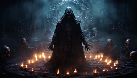 A hooded figure raises their arms as they conjure a mysterious energy amidst swirling smoke, creating an eerie atmosphere perfect for Halloween celebrations.