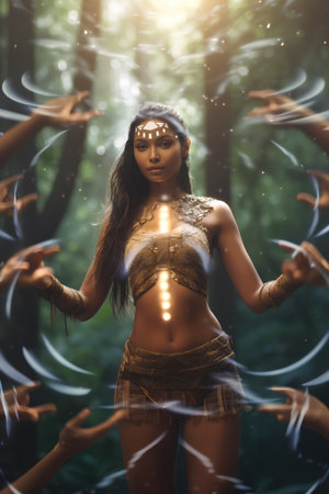 Indian shaman woman adorned with colorful feathers, who appears to be deeply inspired and engaged in an ayahuasca ceremony