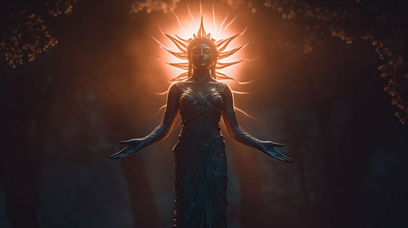 An AI generated illustration of a statue in the forest, a halo of sunlight streaming from its head