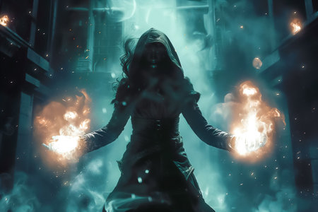 Under a dark, foggy sky, a witch dressed in flowing garments raises her hands as vibrant flames dance around them, casting an alluring glow amid the Halloween magic.