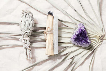 White sage and Palo Santo and amethyst and quartz crystals on a light beige background. Top view. A set of incense for fumigation