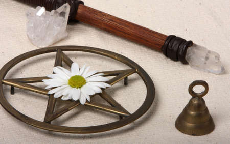 close up of wiccan objects - pentacle wand bell crystal and flower