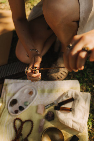 Close up of female hands lighting incense sticks in park before yoga. Buddhist healing practices. Mindful meditation concept. Clearing the space of negative energy. Aromatherapy. Part of the series.