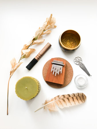 Tibetan singing bowl, scented candle and accessories for meditation and relaxation, vintage style color