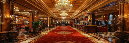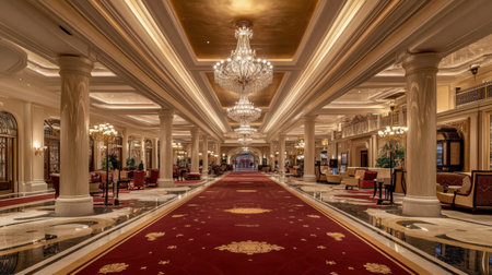A lavishly designed casino lobby showcases grand chandeliers, rich red carpets, and elegant marble floors, creating a sophisticated ambiance.