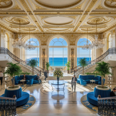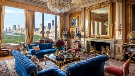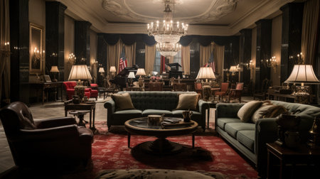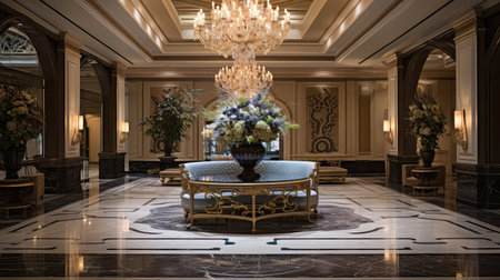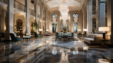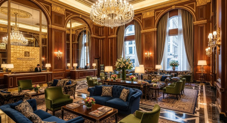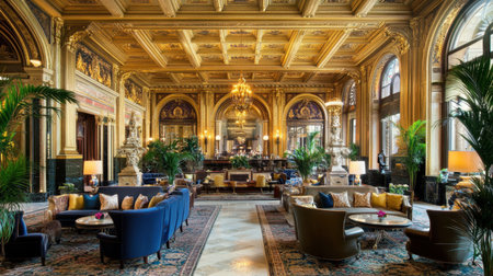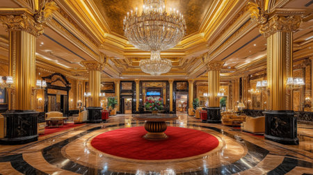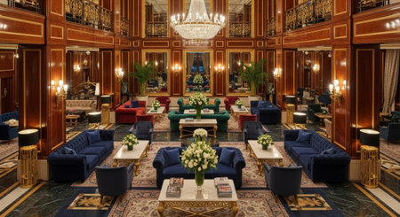 This opulent interior shot showcases a luxurious hotel lobby, featuring classic furniture, ornate details, and grand lighting, suitable for advertising luxury hospitality.