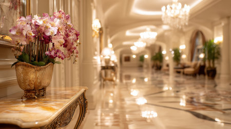 A beautiful hotel corridor features a marble table at the front with a vase of flowers. The background shows elegant lighting and decor.