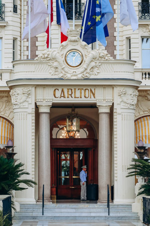 Cannes, France - 30 June 2023: Close-up of the facade of Carlton hotel in Cannes