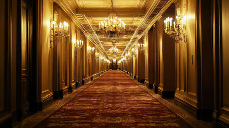 A stunning view of an elegant hallway featuring ornate chandeliers and rich decor, capturing timeless luxury and sophistication in architecture. Perfect for design themes.