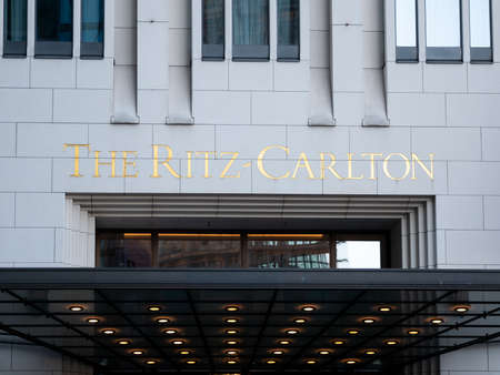 BERLIN, GERMANY - FEBRUARY 8, 2020: The Ritz-Carlton Logo At The Hotel At Potsdamer Platz Square In Berlin, Germany