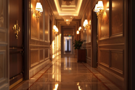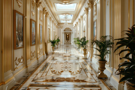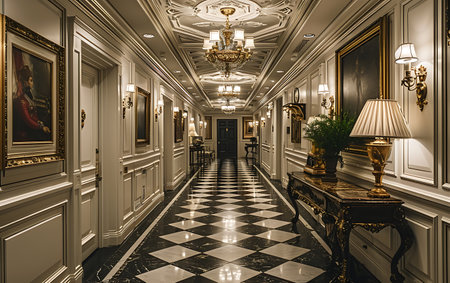 A classical corridor interior often features intricate architectural details such as crown molding, wainscoting, and high-quality flooring like hardwood or marble