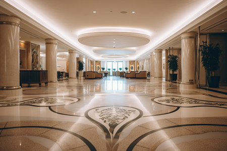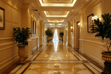 Luxury hotel lobby interior with a long corridor and ceiling light