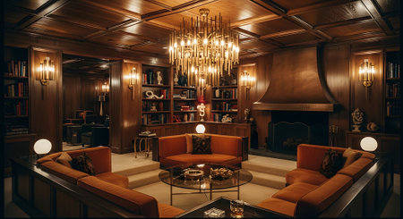 A luxurious hotel lobby with classic decor features a grand chandelier, plush seating, and rich wood paneling, suitable for editorial and commercial use.