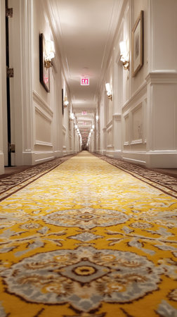 A long hallway with a detailed patterned carpet stretches into the distance. Bright, warm lighting from wall fixtures illuminates the space, creating a sense of depth and symmetry. The image showcases architectural design with its clean lines and repeating elements. Suitable for illustrating concepts of interior design and commercial spaces.