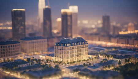 An aerial view of a city at dusk. A central, classical-style building with a mansard roof is illuminated, surrounded by other buildings and distant skyscrapers. The city lights create a bokeh effect in the blurred background, suggesting a metropolitan area at night.