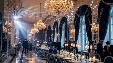 A long, ballroom is set with a grand banquet table stretching across the room, illuminated by dramatic spotlights and the warm glow of crystal chandeliers. Dark navy blue drapes adorn the walls, creating a rich backdrop for the meticulously set table with white floral arrangements and silver accents. Mirrored walls reflect the light and the attendees, enhancing the sense of grandeur and sophistication. The atmosphere is one of exclusive celebration and luxury.