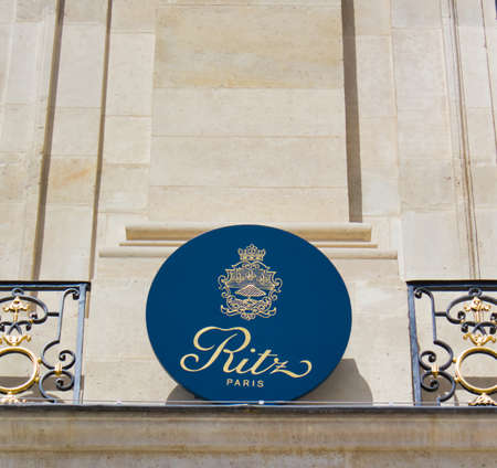 PARIS, FRANCE - JULY 21, 2017: Ritz, luxury hotel golden sign in place Vendome in Paris, France.