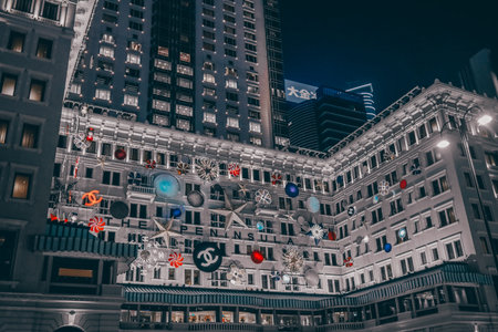 Nighttime view of a white, ornate building adorned with oversized Christmas