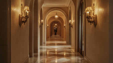 This hallway features stunning classical arches crafted from marble, adorned with soft lighting, creating an atmosphere of elegance and sophistication. The polished floor reflects the ornate details.