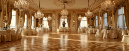 A stunning ballroom featuring ornate chandeliers and a polished floor, where elegantly dressed guests engage in a refined celebration of style and grace.