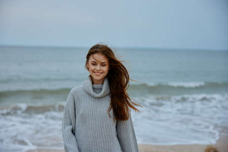 cheerful woman cloudy weather by the sea travel fresh air unaltered