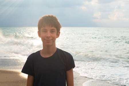 Teen boy walking on beach at sunset