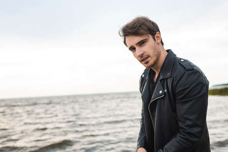 Young man in leather jacket looking at camera near sea