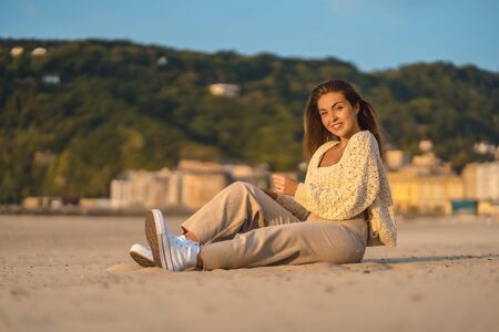 Summer lifestyle, a young blonde with straight hair, in a small wool sweater and corduroy pants sitting on the beach with the city in the background. Smiling a lot at sunset