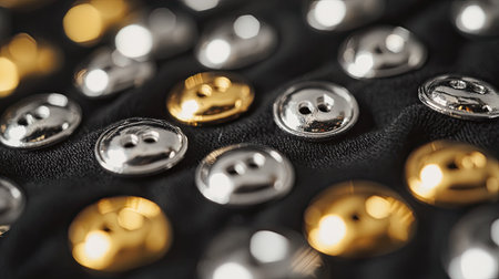 A close-up view of shiny metallic buttons in silver and gold colors scattered on a black fabric surface, showcasing intricate details and textures.
