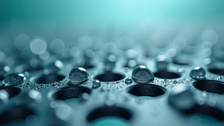 Close-up of purple liquid drops on metallic surface with soft light reflections. That the image is generated using AI.