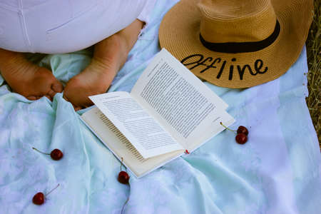 Paper book lying open on blue plaid, ripe red cherries, a straw hat with a word Offline, women's feet. A lady reading a book in nature during summer holiday, vacation. A young lady, woman rest outdoor
