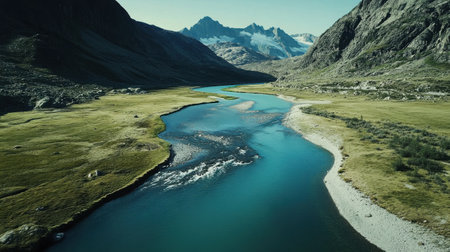 graceful curves of a meandering river as seen from a bird's-eye view. Generative AI