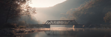 A stunning bridge gracefully arches over calm waters, surrounded by a misty atmosphere at dawn. The soft hues of morning light reflect on the surface, creating a peaceful ambiance.