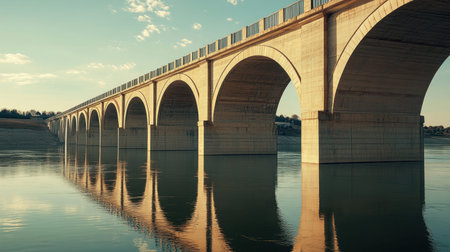 A concrete bridge dominates the composition, extending across tranquil water. The image features a low-angle perspective with dramatic lighting, showcasing textures of concrete and water. The color palette includes shades of blue, orange, and gray, suggesting a dusky environment. Suitable for various commercial and editorial applications.