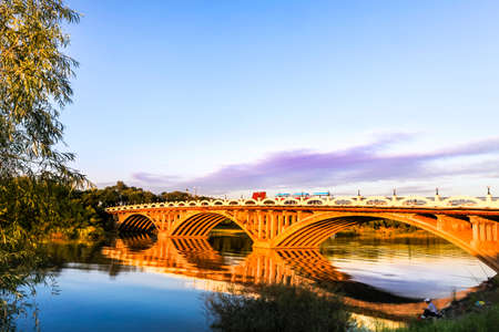 This breathtaking image showcases a majestic arched bridge reflecting perfectly in the calm waters below, capturing the serene beauty of nature during golden hour.