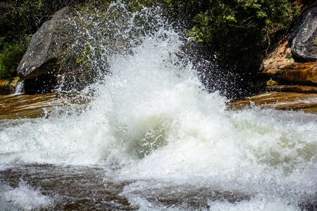 This close-up image captures dynamic water splashing over textured rocks in a stream, showcasing the beauty of nature and tranquility.