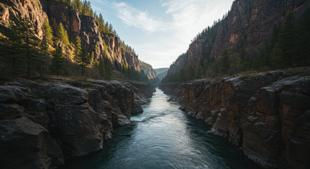 Wide river flowing rapidly through a deep canyon, bordered by steep, rugged rock walls and scattered evergreen trees. sunlight illuminates the natural landscape.