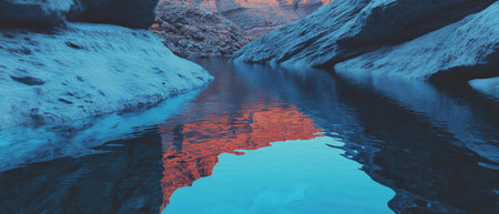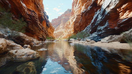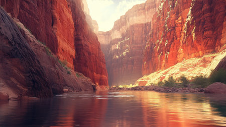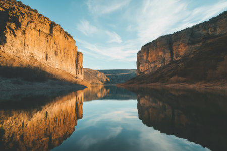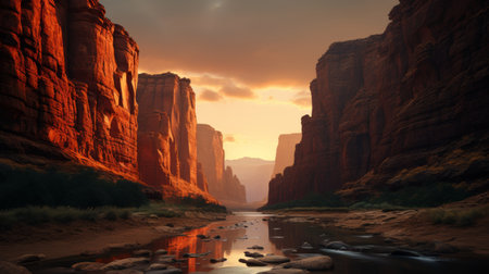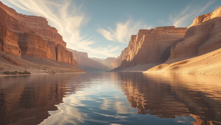 AI Generated. Serene Canyon with Reflections in Golden Light