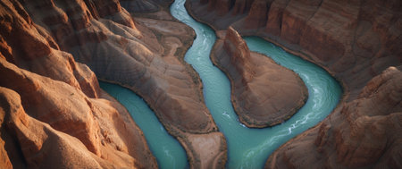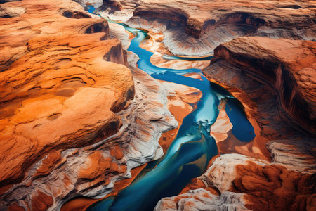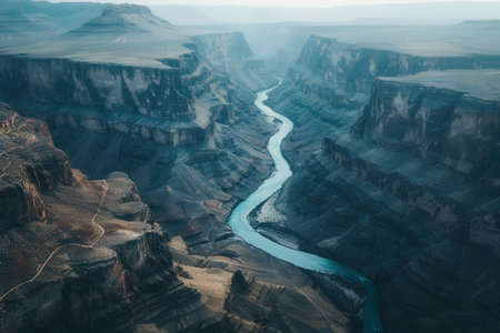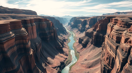 AI Generated. Aerial View of a River Winding Through a Canyon with Layered Rock Formations