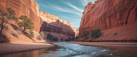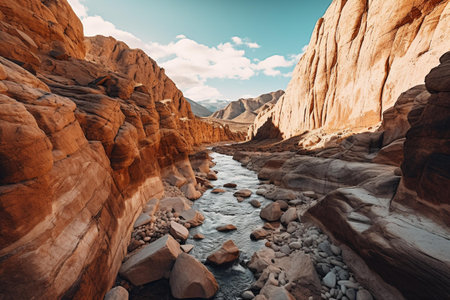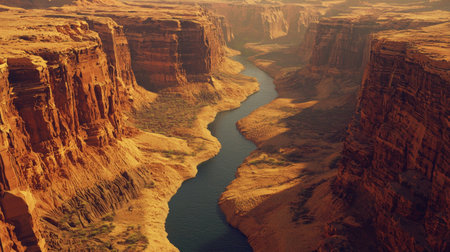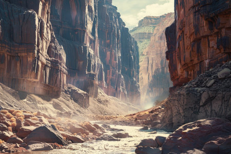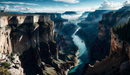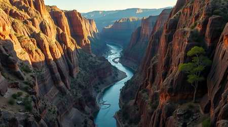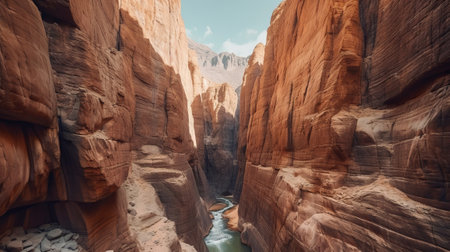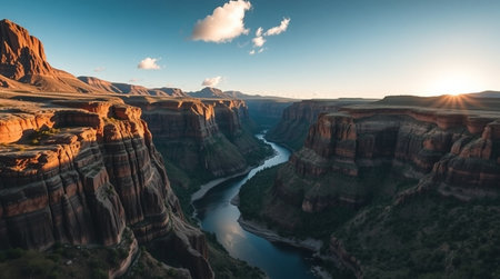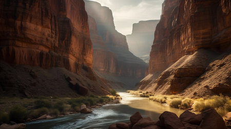 AI Generated. sunlit canyon with river a deep canyon carved over millennia by