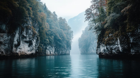 Explore a serene canyon enveloped in mist, featuring calm waters and rugged cliffs. This tranquil landscape invites adventure and reflection in nature.
