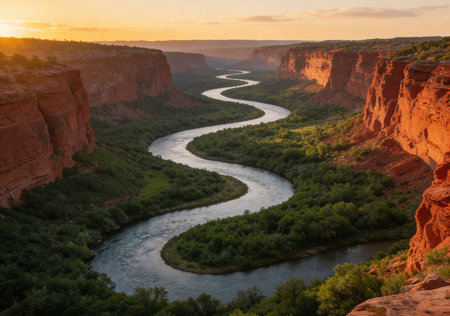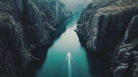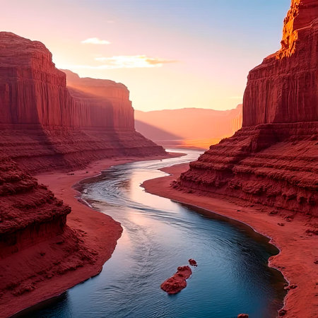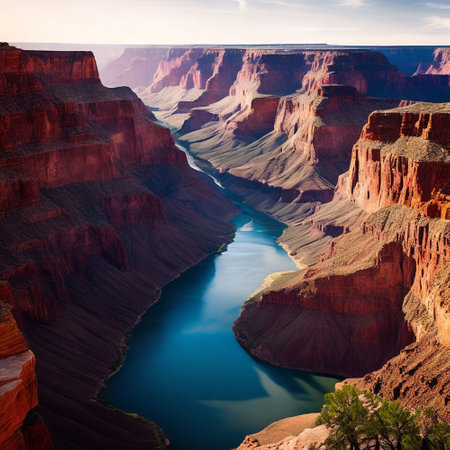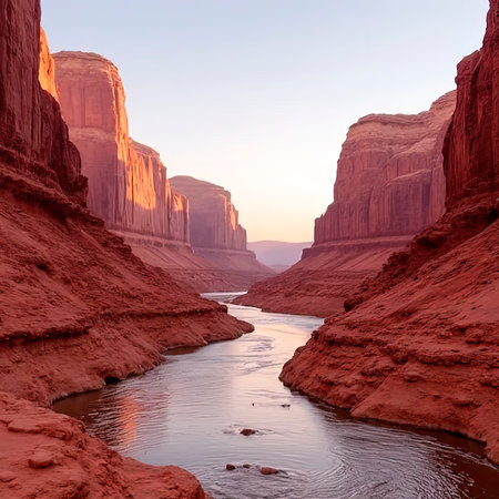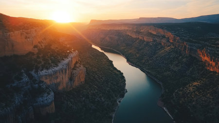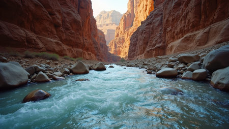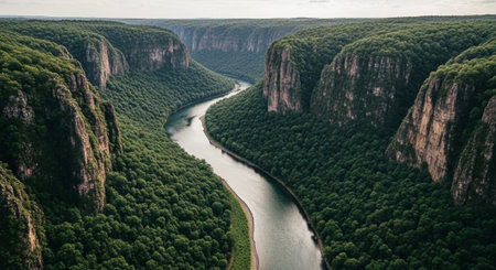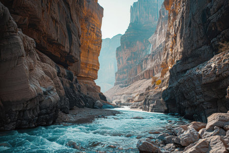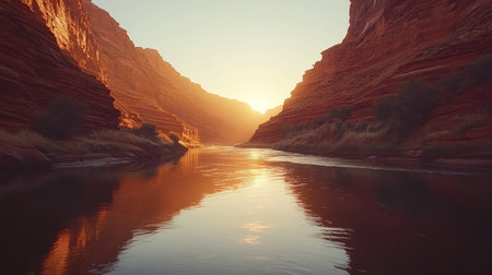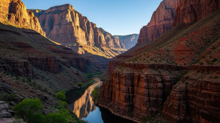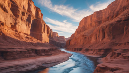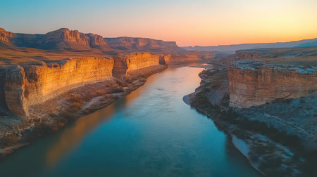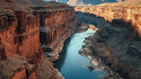 Breathtaking view of a peaceful river flowing through a majestic rocky canyon landscape with towering cliffs and serene reflections on the water s surface An natural wonder inviting and adventure