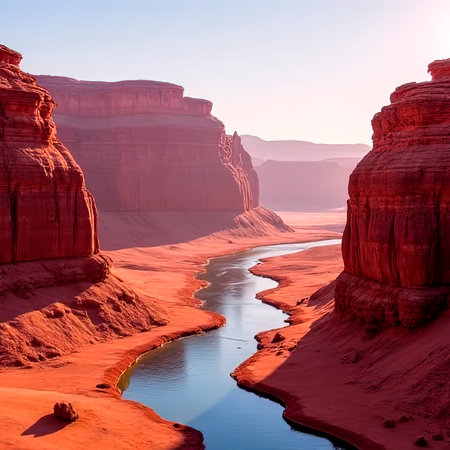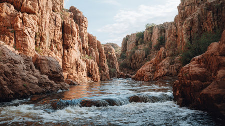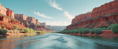 A breathtaking view of a serene river gently flowing through a majestic rocky canyon, framed by vibrant landscapes and bright sky, inviting exploration and tranquility.