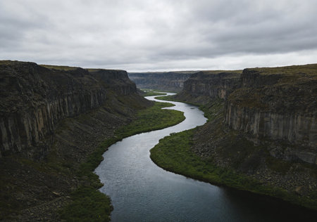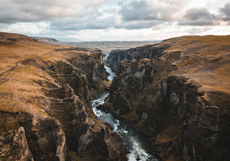 Icelandic landscape with river and canyon in cloudy weather. Iceland