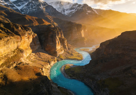Majestic winding river cutting through a dramatic canyon landscape with towering rugged cliffs and mountains in an arid remote desert environment Scenic natural