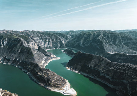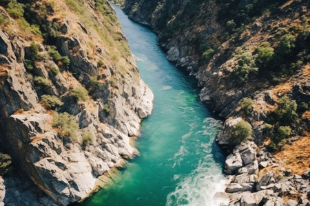 Steep canyon with jagged rocky cliffs rising on both sides of the narrow winding river. AI generated.