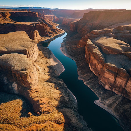A picturesque view of a narrow canyon with a river snaking through its rocky, sun-drenched depths.