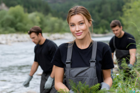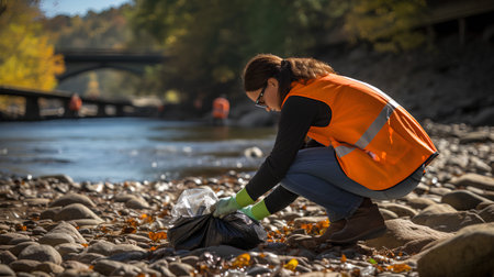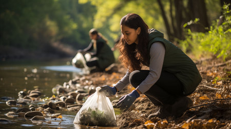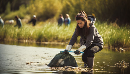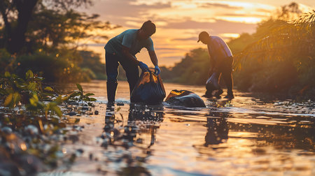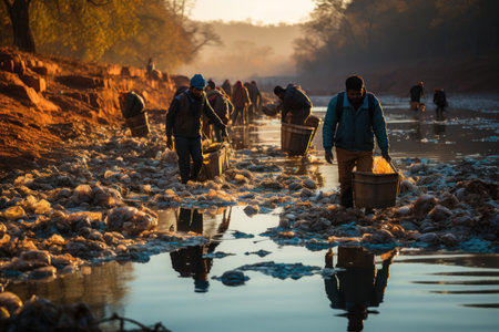 A dedicated group of volunteers cleans up a polluted riverbank, striving to restore the waterway and protect the environment.Generated image